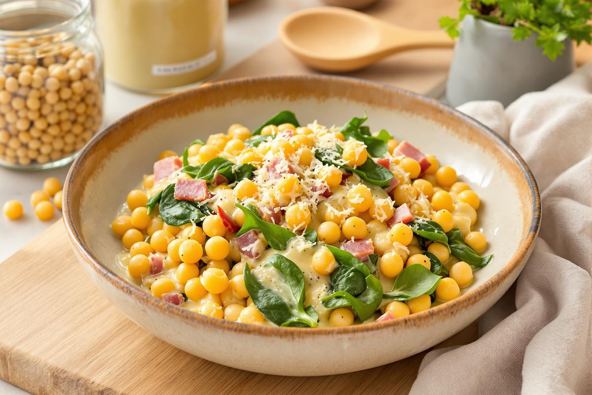 On associe souvent la carbonara à un plat riche et gourmand… mais peu diététique. Ici, les pois chiches remplacent les pâtes, et le résultat est aussi savoureux qu’innovant.